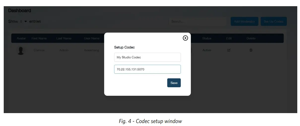The first step within the dashboard is to set up the Comrex codec connection by clicking “Set Up Codec” in the upper right corner.