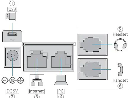 Connect the power adapter, network, PC, handset and headset to the corresponding ports.