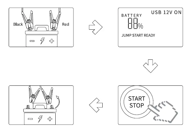 - Insert jumper cables into the jumping socket, and connect the product with the car battery.