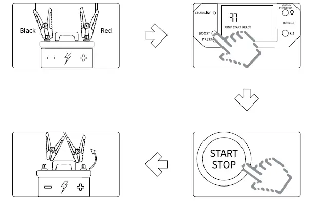 - Ensure the jumper cables are connected correctly, and the battery level is above 20%. Press and hold the Boost button for 2-3 seconds until a 30- second countdown appears on the screen.
