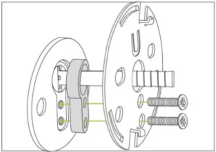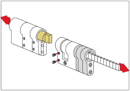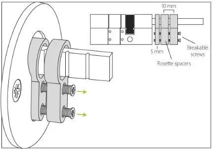 To avoid pulling the cylinder out of place you need to find the right spacer or a spacer combination between the rosette and the back plate.” Unscrew the two breakable screws that holds the spacers together with the adjustable cylinder.” Choose one or more spacers so they flush with the rosette surface. (See next illustration).