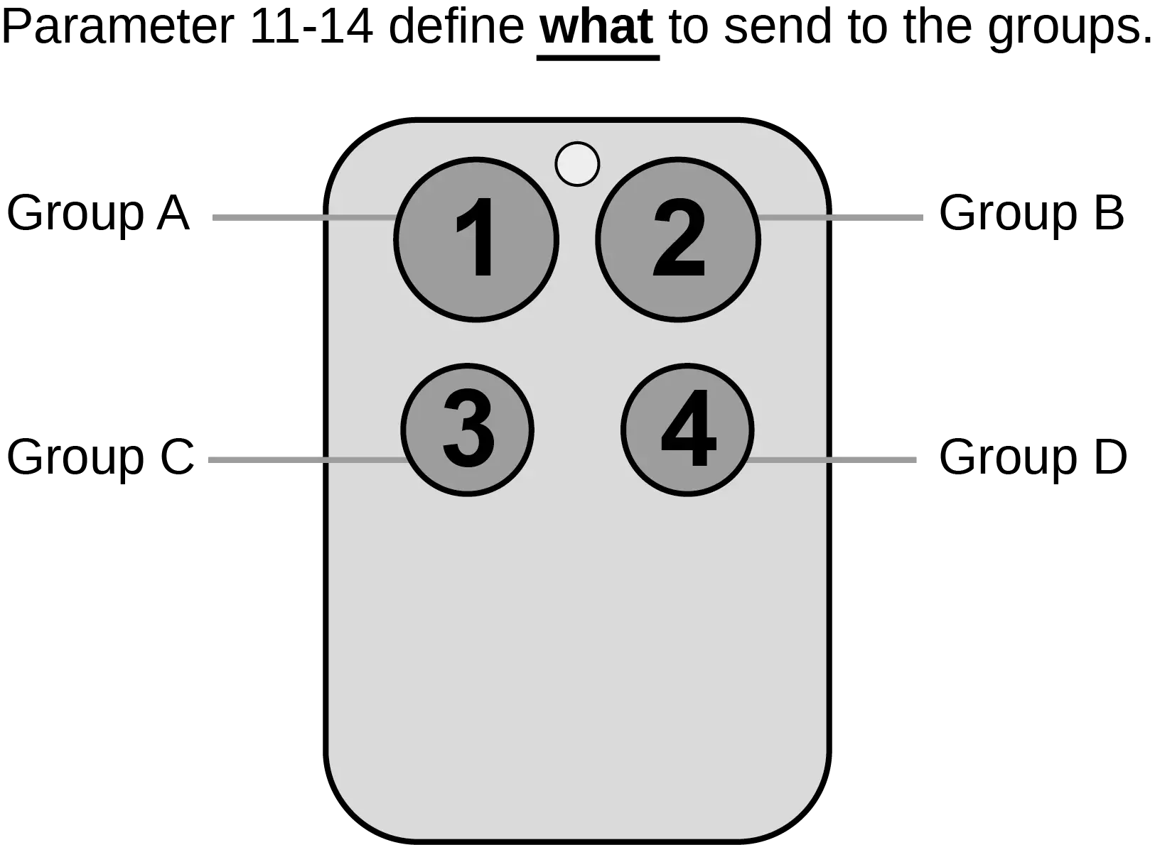 4 Groups are controlled with single button (parameter 1/2 = 0) The four buttons 1-4 control one single control group each: 1->A, 2->B, 3->C, 4->D. Single click turns devices in the control group on, double click turns them off. Click and hold can be used for dimming.