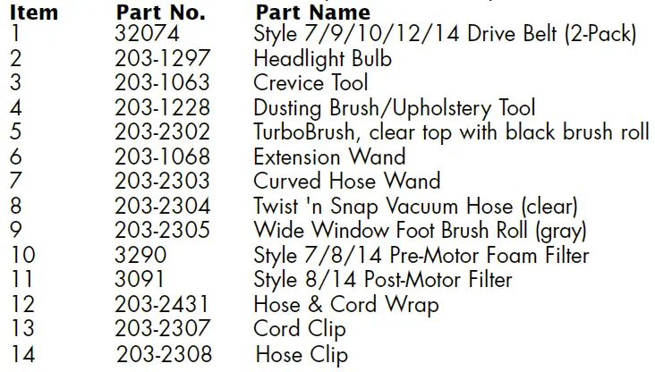 You may purchase parts from your retailer, by calling BISSELL Consumer Services or by visiting our website. Below is a list of common replacement parts. While not all of these parts may have come with your specific model, they are available for purchase if desired. Please note, all attachments may not store on board your vacuum.