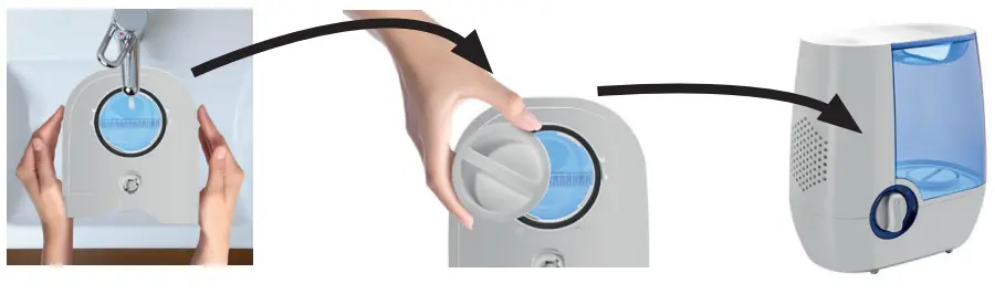 - Carry the humidifier base to the sink and drain any remaining water. Wipe clean and dry with a clean cloth.