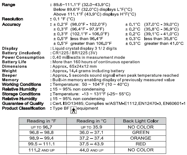 5. Once the degree sign °F (°C) on the display stopped flashing, the correct temperature is indicated and Fever Signal will light up color according to the measured temperature. The temperature reading will not change after the °F (°C) stops flashing.