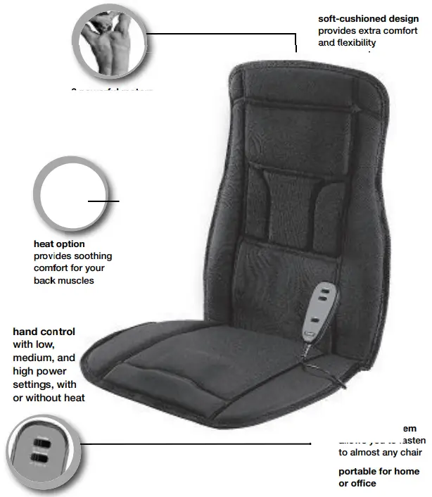 Your Body Benefits ® Heated Massaging Seat Cushion is designed to be used in your home or office. We have provided an AC adapter for use in a 120 volt outlet. For your safety, please use only the adapter provided with this massager. Elastic straps are attached to the seat, which allows you to securely fasten the massager to almost any chair.