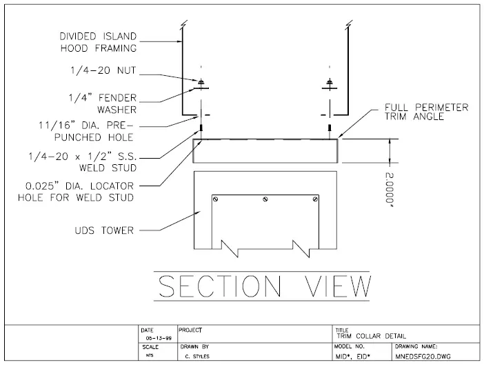 Place trim collar on tower, Position tower under hood. Fully tighten trim collar retaining hardware after the UDS tower is in proper location. See diagrams f-1,2,3. See pages 12,13,14. - Hanging Rod Detail