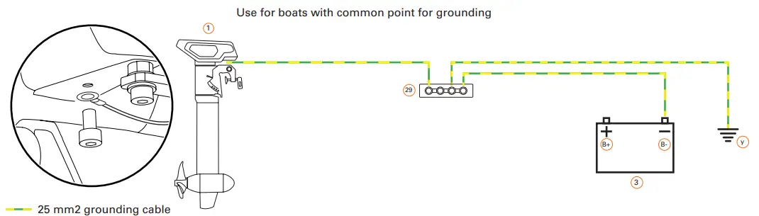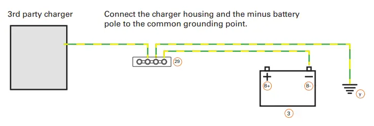 In case using a charger permanently installed in the boat, the charger housing or its AC PE and battery minus pole must be connected to the common grounding point.