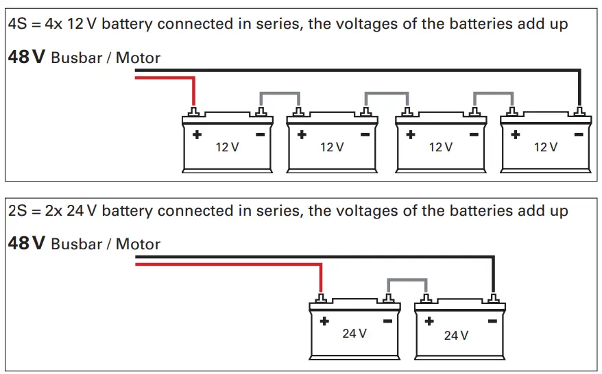 Examples for the wiring of a 48V 3rd party battery bank, provided by customer