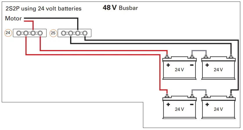 NOTE! When connecting the Torqeedo system to the battery bank, make sure that the motor is connected diagonally to the battery bank. See exemplary illustrations on next page.