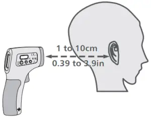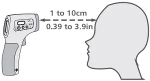 - Aim towards the forehead (see the diagram below for the positioning), from a distance of 5cm(2in), press the measuring key, the temperature is displayed immediately. Making sure there is no hair, perspiration, cosmetic or cap covered on the forehead.