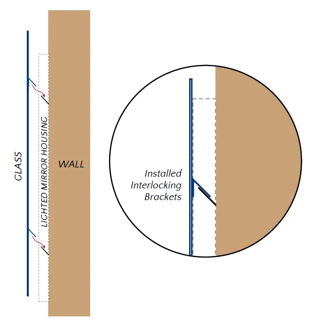 - Ensure the brackets are interlocked and the mirror is secure by making sure the mirror is level and evenly spaced from the wall. Gently try to move the mirror glass. If you can pull any of the four corners away from the housing, then it’s not mounted properly. If the glass moves, it’s likely not fully interlocked and you need to repeat this step to align the mounting brackets.