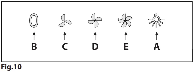 If your appliance has the INTENSIVE speed function, from speed THREE, press key E for 2 seconds and it will be activated for 10 minutes after which it will return to the previously set speed. When the function is active the LED flashes. To interrupt it before the 10 minutes have elapsed, press key E again. Some models allow activating this function even with speed one and two.