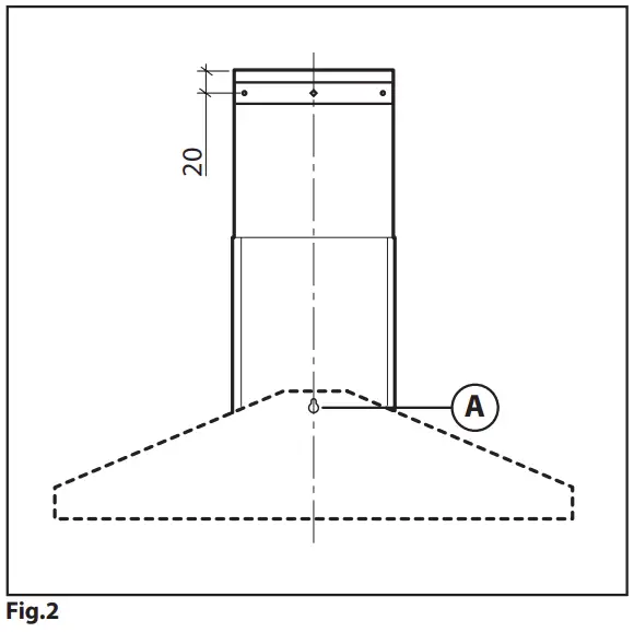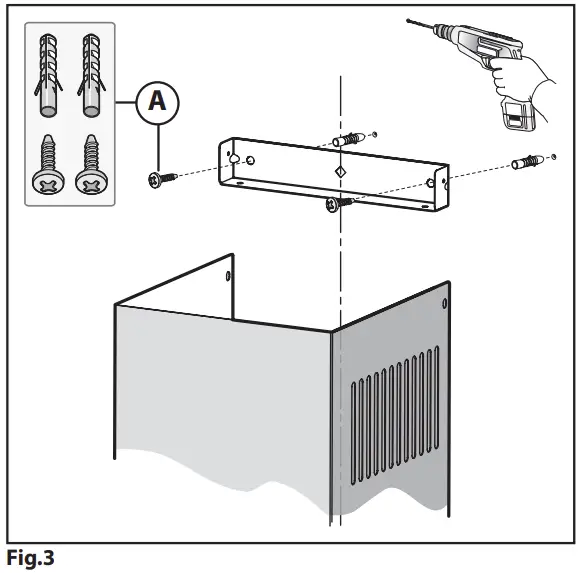 Make hole A respecting the shown dimensions (Fig.2). Fix device to wall and align it horizontally with the cupboards. When the appliance has been adjusted, definitely fix the hood using the screws A (Fig.5). For the various installations use screws and screw anchors suited to the type of wall (e.g. reinforced concrete, plasterboard, etc.). If the screws and screw anchors are provided with the product, check that they are suitable for the type of wall on which the hood is to be fixed.