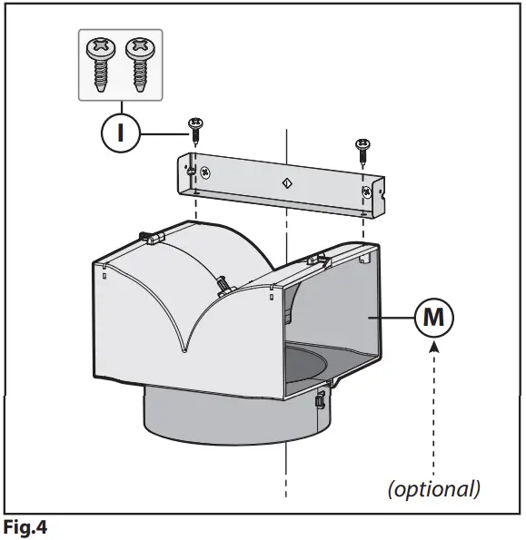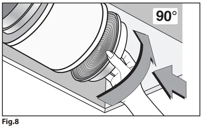 Install the hood and the two flues as described in the paragraph for installation of the hood in ducting version. Connect air diverter M (not supplied) to bracket and fix it with screws I as shown in Fig.4. The active charcoal filters must be applied to the suction unit inside the hood, centring them in it and turning them 90° until they snap into place (Fig.8).