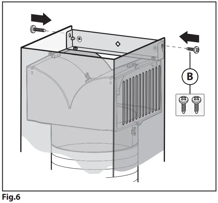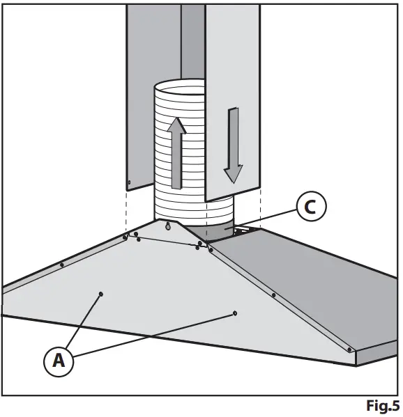 Arrange the electrical power supply within the dimensions of the decorative flue. If your appliance is to be installed in the ducting version or in the version with external motor, prepare the air exhaust opening. Install the upper decorative flue’s support bracket and fix it on the wall using the screws A (Fig.3) so it is in axis with your hood and respecting the distance from the ceiling shown in Fig.2. Connect flange C to air extraction hole via an air extraction pipe (Fig.5). Insert upper decorative flue inside the lower decorative flue and rest them on top of the frame. Extract the upper flue up to the bracket and fix it with the screws B (Fig.3). To transform the hood from a ducting version into a filtering version, ask your dealer for the charcoal filters and follow the installation instructions.