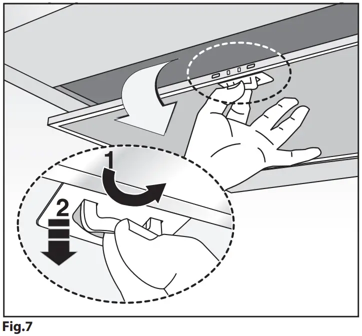- The minimum distance between the support surfaces of the cooking pots on the cooker top and the lowest part of the cooker hood must be at least 65 cm. If a connection tube composed of two parts is used, the upper part must be placed outside the lower part. Do not connect the cooker hood exhaust to the same conductor used to circulate hot air or for evacuating fumes from other appliances generated by other than an electrical source. Before proceeding with the assembly operations, remove the anti-grease filter(s) (Fig.7) so that the unit is easier to handle.