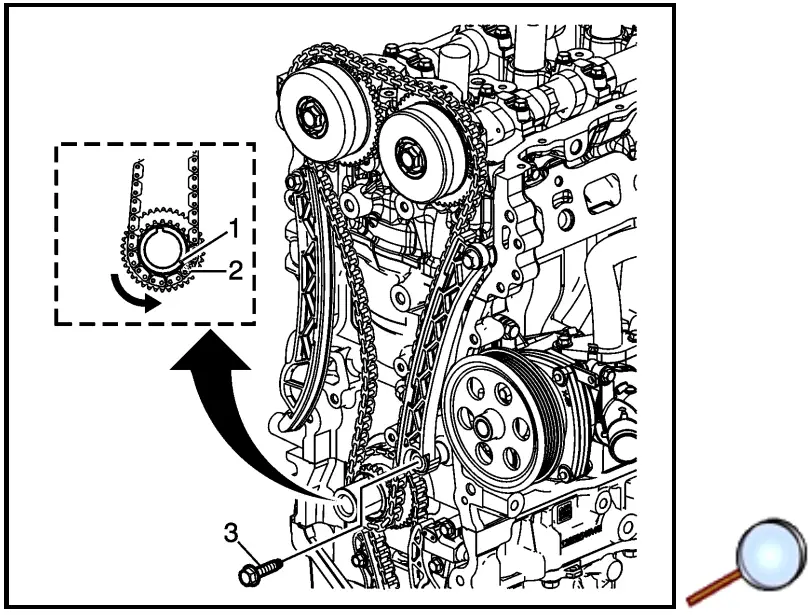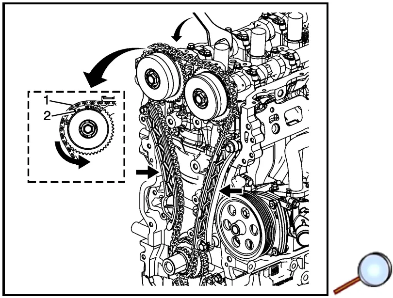 - With a suitable tool, rotate the crankshaft counterclockwise to align the timing mark on the crankshaft sprocket (1) with the timing link (2).