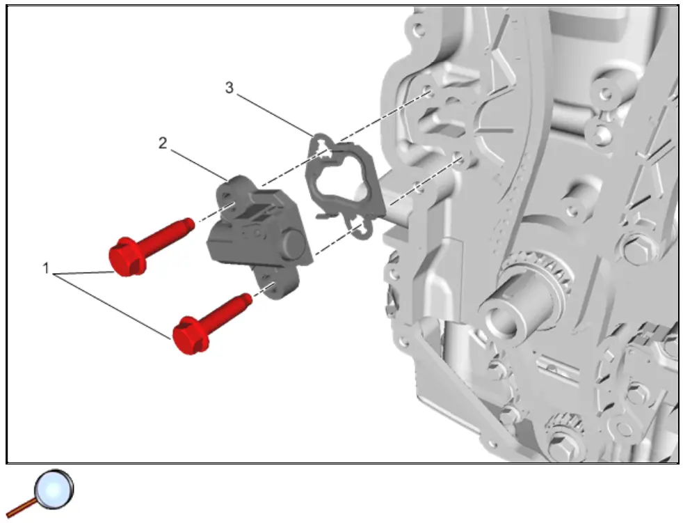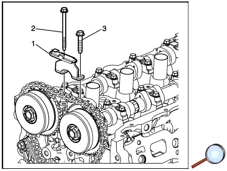 - Install the timing chain guide (1) and bolts (2, 3) finger tight.