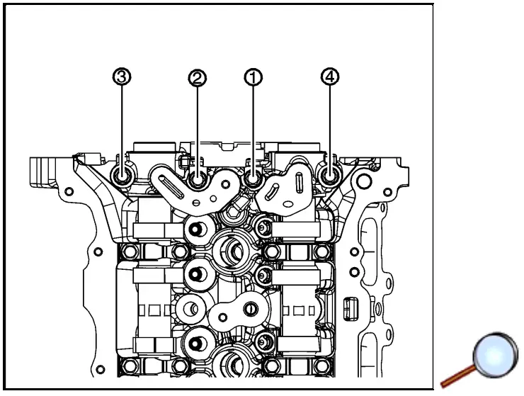 - Tighten the front camshaft cap bolts in sequence to 10Y (89 lb in) twice.