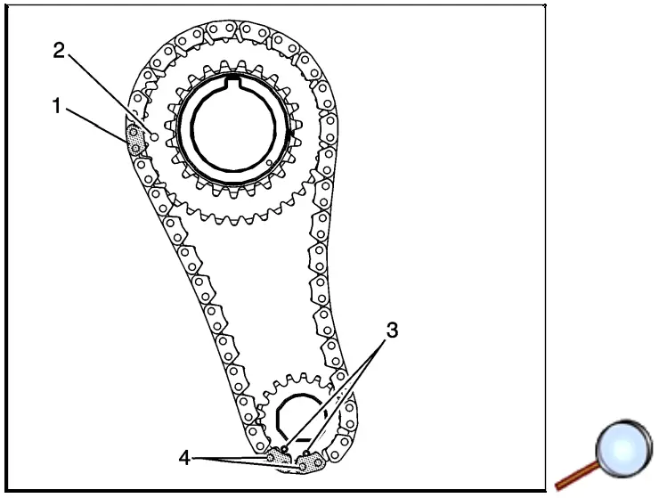 Note: Due to the difference of crankshaft sprocket and balance shaft sprocket, timing marks on the chain will not match during every crankshaft revolution. Ensure that the marks on the sprockets are aligned appropriately before installing the timing chain. - Verify the timing links on the balance chain are properly aligned to the timing marks:
