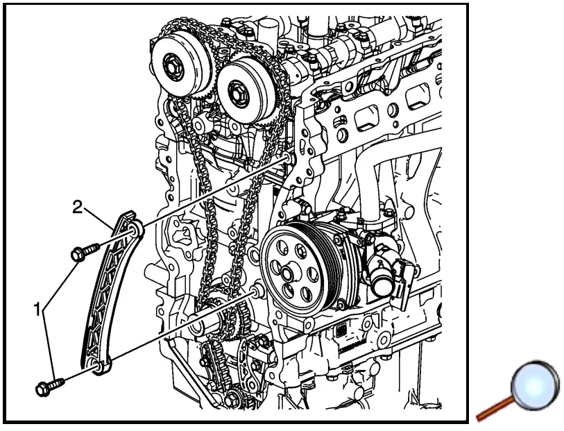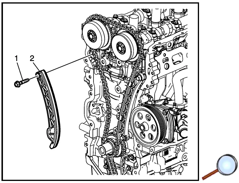 Note: Timing will be established before the final install and torque of the guide bolts. - Install the timing chain guide (2) and upper bolt (1) only, finger tight.