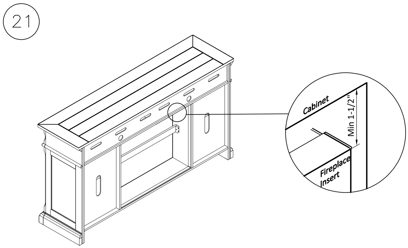 WARNING: The gap between the fireplace’s top with any obstacles above it must be a minimum of 38 mm. Failure to provide a minimum of a 1-1/2″ gap as instructed could result in a fire, bodily injury, death or property damage.