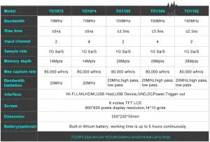 | Model | TO1152 (150 MHz, 2 CH) TO1104 (100 MHz, 4 CH) T01102 (100 MHz, 2 CH) TO1074 (70 MHz, 4 CH) T01072 (70 MHz, 2 CH | TO1152 TO1104 TO11 02 TO1074 TO1072 |