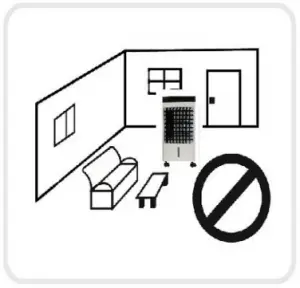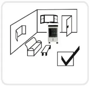 - The evaporative air cooler should not be used in enclosed or sealed spaces. It must be kept level and there must be water in the tank. Doors and windows should be open to allow free air flow. The evaporative air cooler works best when placed near an open window / air current.