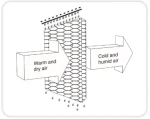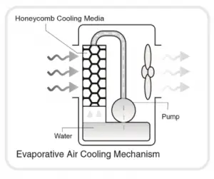 The air cooler cools the air by means of evaporation. When water evaporates into the air, the result is a mixture of air and water molecules. This chemical change requires heat which is taken from the water molecules, resulting in a spot cooling effect.