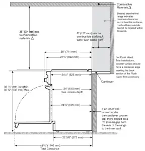 * Models PCG305xx, PRD305xx, PRD606xx, PRG305xx, PRG304xx and PRD304xx are suitable for 0″ rear clearance to combustible surfaces. All other models: when using the included Island Trim a minimum 6″ (152 mm) rear clearance is required to a combustible surface. When installing against a combustible surface, a Thermador® Low Backguard is required for a 0″ rear clearance to the combustible surface. A Thermador Low Backguard must be purchased separately. A rear clearance to a surface covered in a noncombustible material (metal, ceramic tile, brick, marble, or stone) is 0″ when using the included Island Trim. Clearances of less than 6″ (152 mm) should be approved by the local codes and/or by the local authority having jurisdiction. Clearances from non-combustible materials are not part of the ANSI Z21.1 scope and are not certified by CSA.