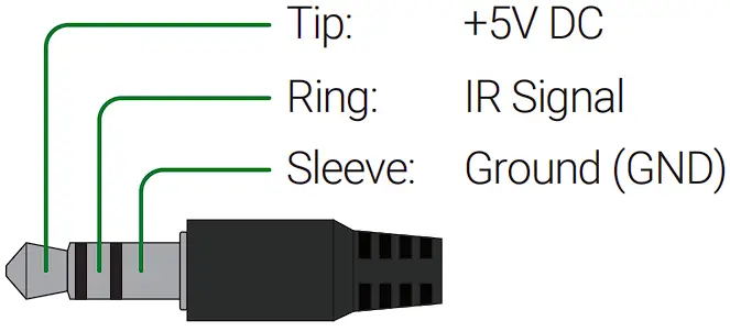 Connection for IR RX (receive) uses a 3.5mm (1/8in) stereo jack that outputs +5V DC to power the included IR receiver.