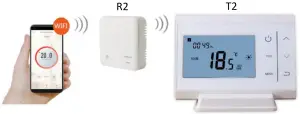 Note: The first R2 paired to a T2 also becomes its internet Gateway. LED 1 will flash slowly RED until paired with the Smartlife App. The R2 will function under the control of the T2 without SmartLife, but LED 1 will always flash slowly red. The T2 display will indicate if heating is on or off.