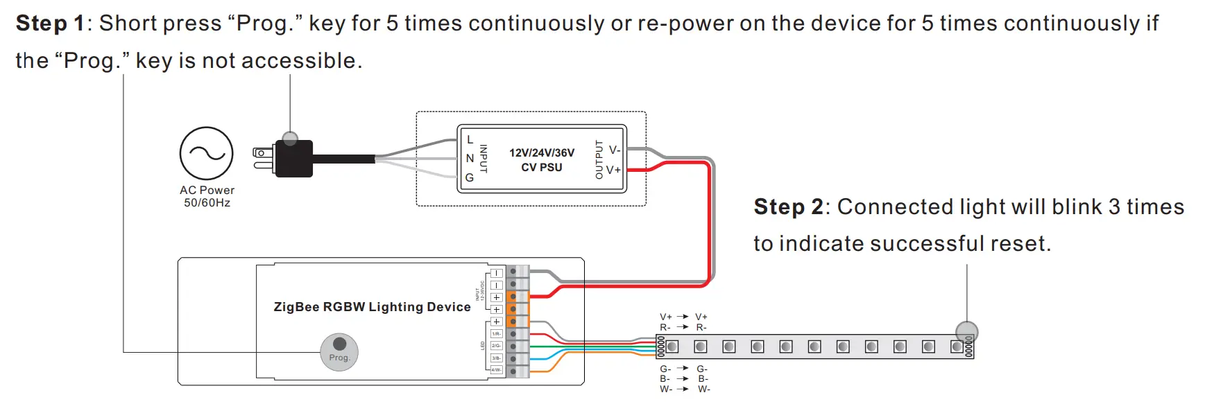 Note: W channel can only be controlled through color temperature control command since Zigbee only has tunable white control. Color temperature control will mix RGB channels as 1 channel white and then make color tuning with the 4th channel white.