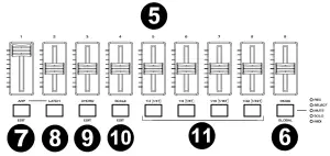 - Faders (19): Push these Faders up/down to perform their assigned controls.