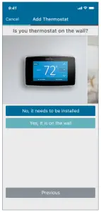 After creating an account, signing in and choosing your model, the app will ask you whether or not the thermostat is already on the wall. You will either choose “No, it needs to be installed,” or “Yes, it is on the wall.”