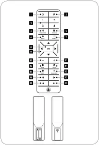 Open the cover on the battery compartment. This can be found on the back of the remote control and can be opened by sliding in the direction indicated. The extent of delivery includes two AAA batteries which must be inserted into the battery compartment for the remote control to work. When inserting the batteries, ensure that they are inserted with the correct polarity. The relevant polarity (+ / -) is marked inside the battery compartment.