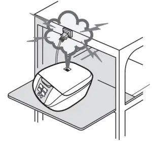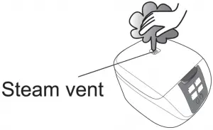 | When there is any overflow of rice water from the steam vent, pull out the power plug immediately to disconnect the power supply. Do not resume the use until the rice water on the power plug and the instrument plug is cleaned with a dry cloth. |