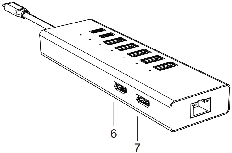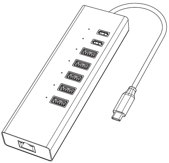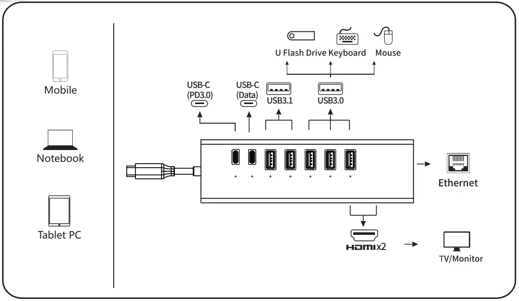 This is an alloy multi-function USB-C HUB adapter. It mainly extends the USB-C interface of the source device to HDMI x2,RJ45, USB3.0X3, USB3.1X2, USB-C and PD.