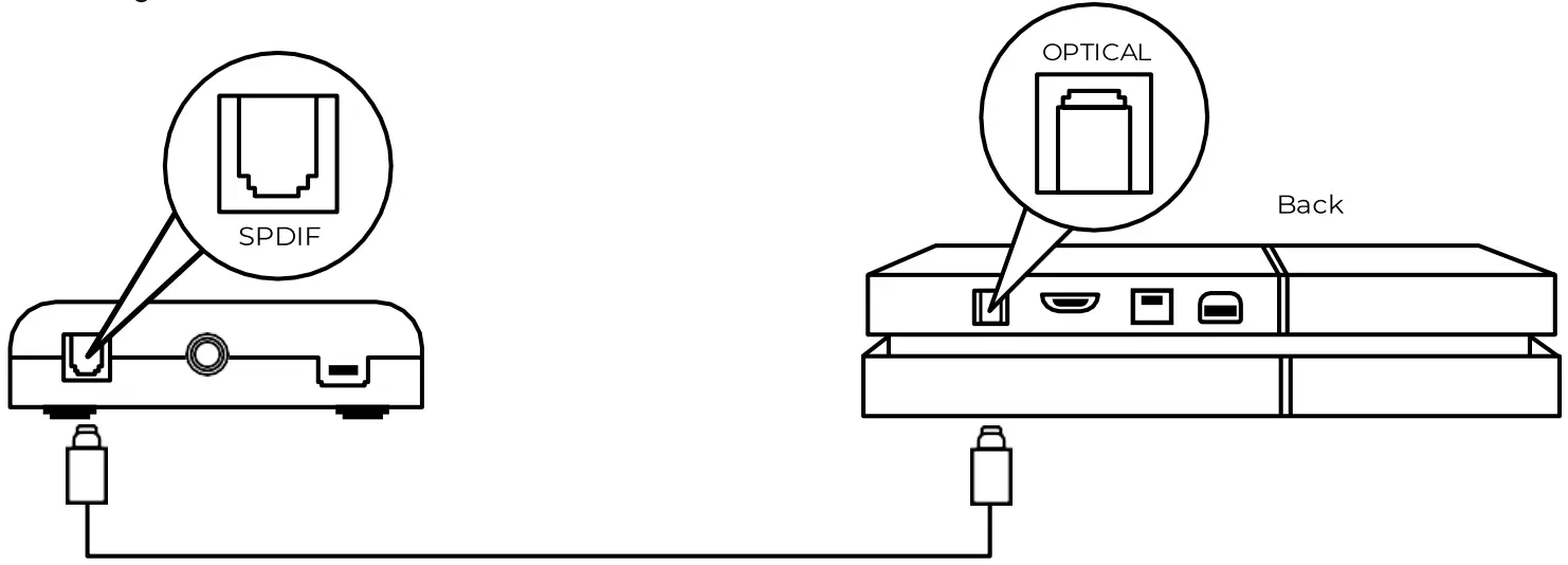 Step 1: Make sure that the PS4TM system is switched OFF. Insert the micro USB cable into the X Rocker DAC converter and the other end into one of the front USB ports on the PS4TM system. Remove the clear plastic covers from both ends of the optical cable. Input one end of the optical cable into the X Rocker Wireless DAC (Slot titled SPDIF) and the other into the Optical SPDIF connector on the PS4TM system.