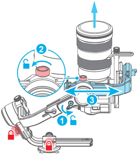 - If the lens is tilt to one side, then the camera is that side heavy, unlock the quick release plate safety lock ① and the move the quick release plate to the opposite direction, until the camera is steady pointing forward.