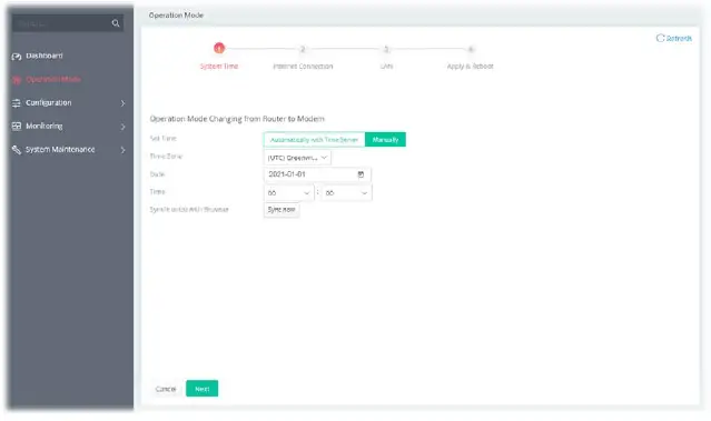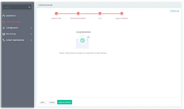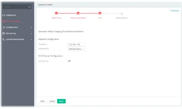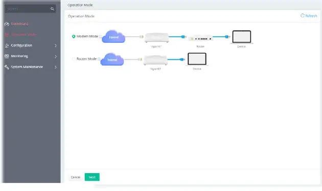 - Open Operation Mode to open the following page. Select Modem Mode and click Next.