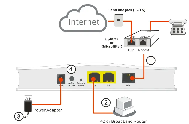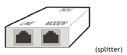 - Connect the DSL interface to the MODEM port of the external splitter with a DSL line cable.