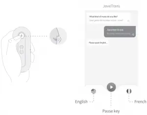 - After the earphones are connected to the phone through Bluetooth, open the JoveTrans App and enter the translation interface. The speaker wearing the left earphone can speak directly, and the other speaker can press and hold the function key on the case to speak. The two speakers can listen to the translation through the earphone/translation stick.