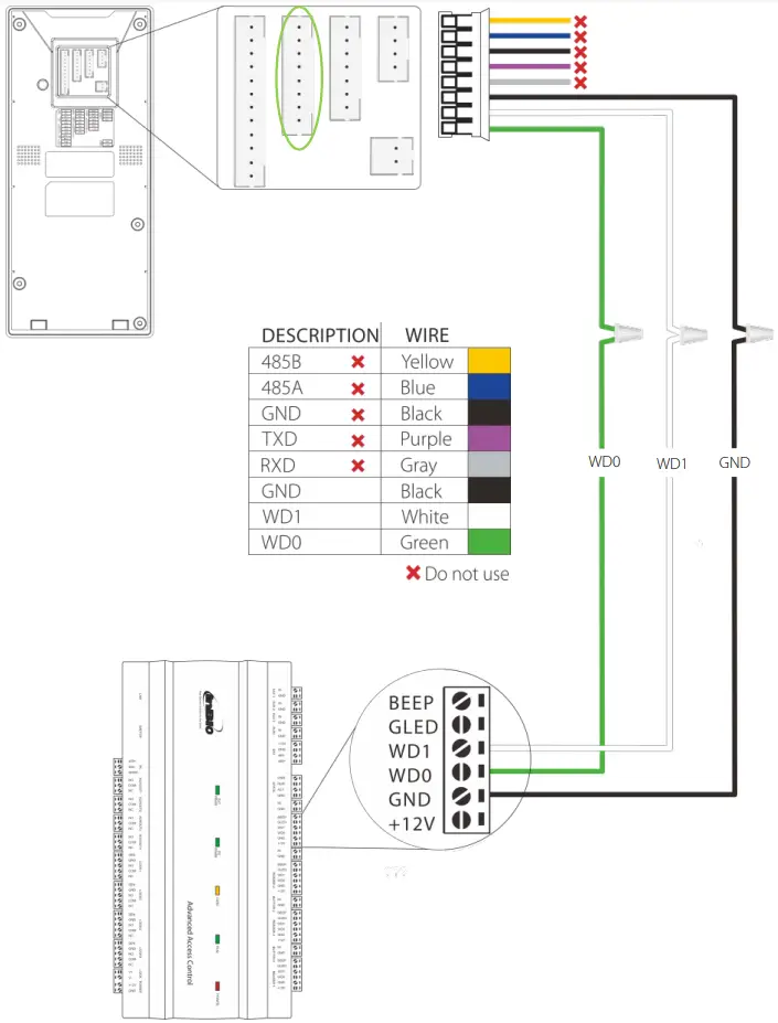 - If RS485 fingerprint reader is powered from the terminal, the length of wire should be less than 100 meters or 330 ft.