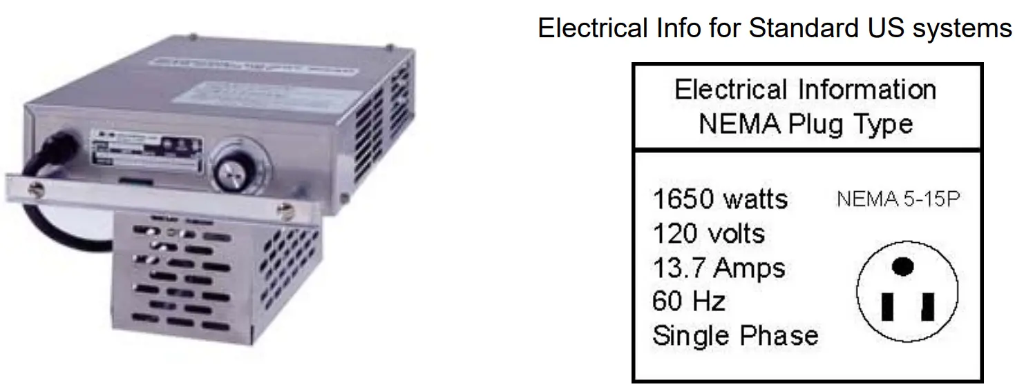 | Power cord is 10′ long If necessary, contact a licensed electrician to install an appropriate 15 amp electrical circuit with correct NEMA receptacle.DO NOT use an extension cord. |