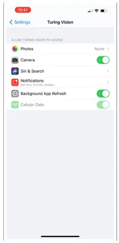 On Settings, click About to see the app’s Turing Vision version number.