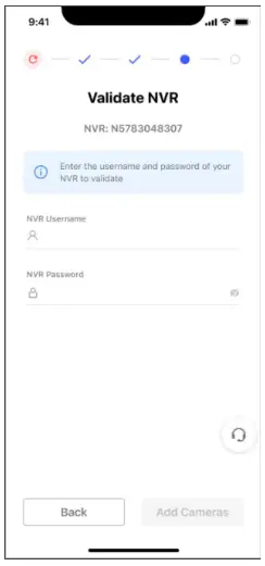 Enter your username and password to validate the connection. Click Add Cameras.