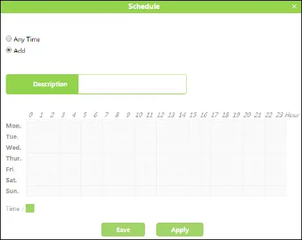 6. Click Configure in the Schedule column, you can select Any Time, or select Add to add a new schedule. Then click Apply.