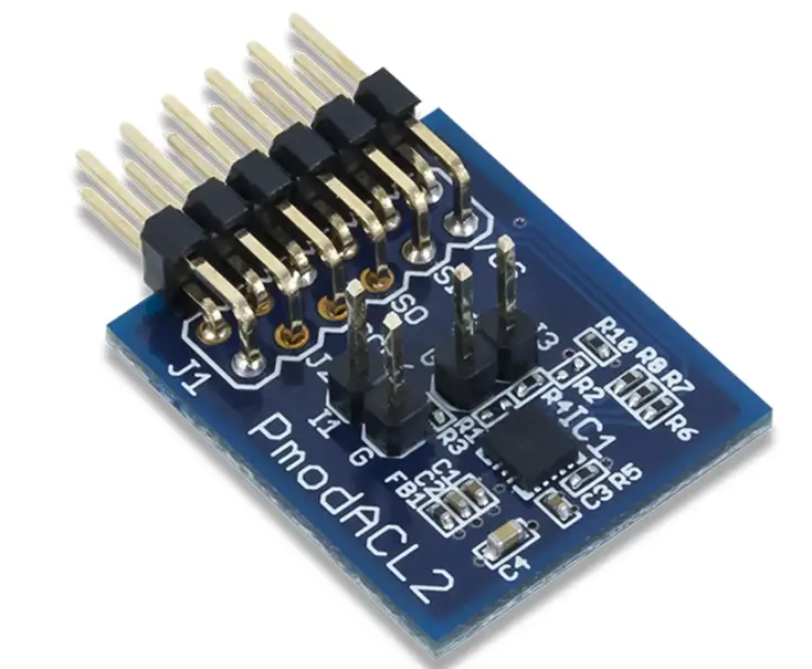 The PmodACL2 is a 3-axis MEMS accelerometer powered by the Analog Devices ADXL362. By communicating with the chip via the SPI protocol, users may receive up to 12 bits of resolution for each axis of acceleration. Additionally, this module offers external trigger sensing through single or double-tap detection as well as power saving features through its inactivity monitoring.